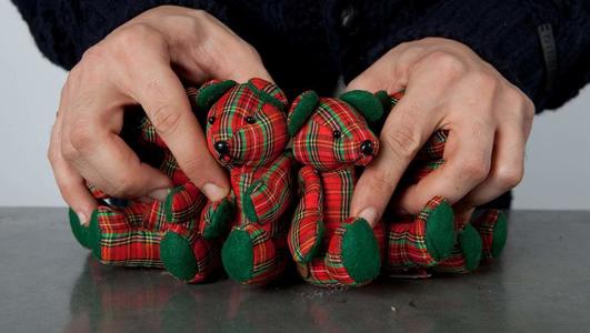 Fournitures : 9 ours, 1 table de déco neo, laine rouge 50 cm, 10 têtes d'épingle, du double face 50 cm, 3 pommes de pin